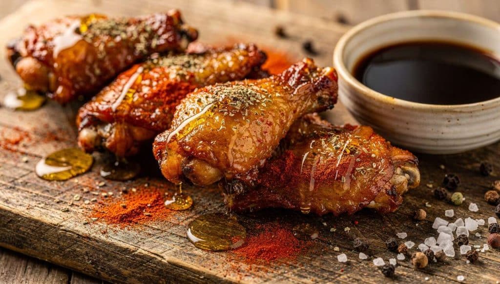 Disposez les ailerons sur un plat large en terre cuite pour rappeler les couleurs chaudes du Mexique. Servez avec des serviettes colorées et des fourchettes en bambou pour une touche d’authenticité.